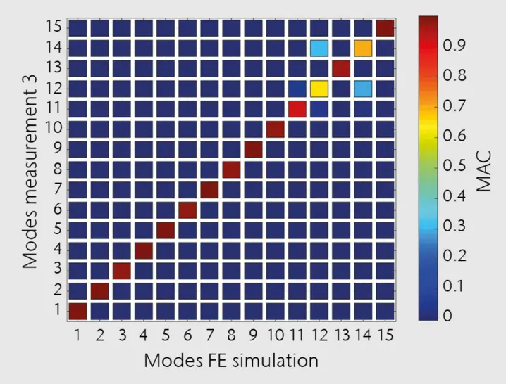 通常,MAC值越接近1则表示模态振型相似度越高,反之,数值越小则表示偏差越大。实验数据表明,低阶模态具有很好的相关性,而一些高阶模态的MAC值较低。更深入的研究表明(参阅参考资料),这些模态振型的偏差可以很好地通过细微的几何误差来解释,由于几何外形的误差破坏了模态振型的对称性,导致少数叶片相比其他叶片的局部振动幅值变大。