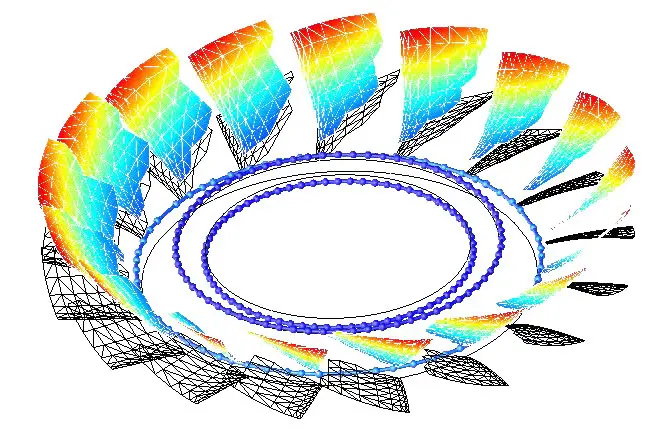 为预测叶盘工作时的实际应力,我们需要有详细的有限元模型。第一步,使用试验方法验证有限元模型的对称性。第二步,调整模型,使其可被观察到失谐现象。因此,我们需要对整体叶盘进行精确的有限元相关性分析,这非常关键。