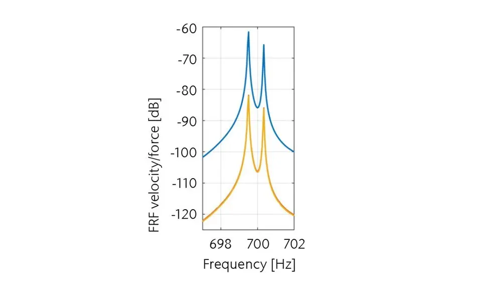 图3为测得的传递函数谱图(FRF),对所有点进行了平均。图2为整体叶盘的部分振型。图4显示的是具有周期性对称的叶盘,原本应成对出现的频率发生频率分离现象(这是非常重要的一个参数),提示出现极小失谐现象。