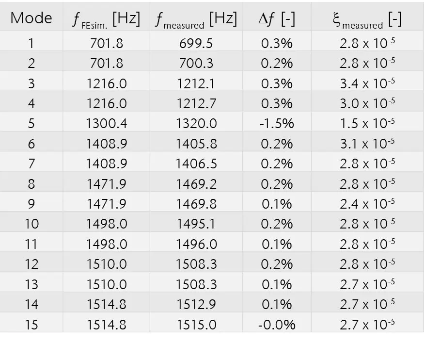 将测量的第一模态族振型与完全对称的有限元模型进行比对。表1给出了测量和仿真得到的频率、频率差百分比,以及测量得到的阻尼比。