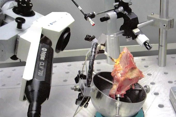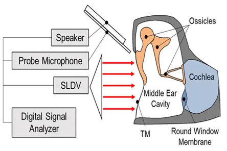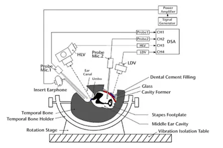 霍夫耳科研究所是最早使用Polytec激光多普勒测振仪(LDV)研究人类耳朵或颞骨的研究所之一。我带领研究小组来搭建使用LDV来测试人类颞骨的试验,通过测量鼓膜和中耳听骨(如镫骨底板)的振动来测试DDHS。试验中,我们设计了一种利用耦合电磁驱动增加镫骨底板振动的助听器。激光振动测量技术在完成DDHS功能测试中起着至关重要的作用。