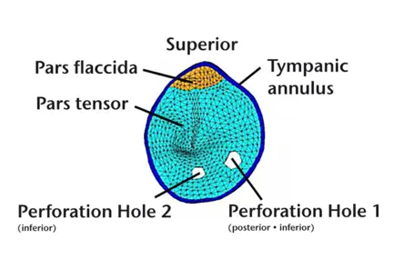 该图像部分为带双腔直耳蜗的人耳三维有限元(FE)模型,用于模拟鼓膜穿孔及鼓膜穿孔对镫骨运动的影响。使用LDV测量人类颞骨(TB)的结果对该模型进行验证。