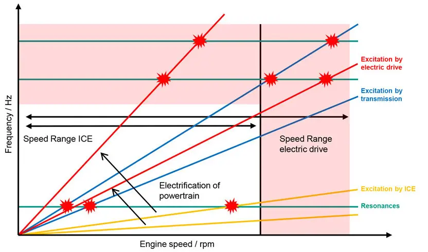 电动机的另一个不同之处是其转速范围比内燃机要高得多。因此,电动机运行时引起的激励通常具有更高的阶数,也即更高的频率(图2)。
