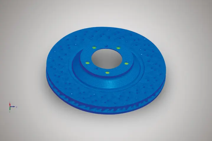 在进行制动盘的模态测试前,将制动盘的有限元模型导入至PSV软件,该模型大约有15万个节点(如图2所示)。从网格中选出四个具有代表性的点进行定位校准,以便于软件计算出各点坐标,完成这一步需要将三束激光的交点依次移动到这四个点所在位置,存储相应的机械臂位置,并将有限元网格中的相应坐标分配到这些位置上。