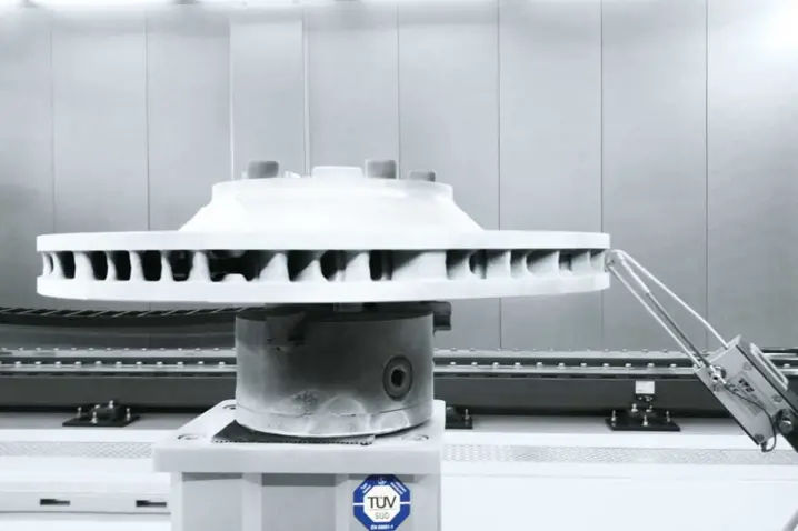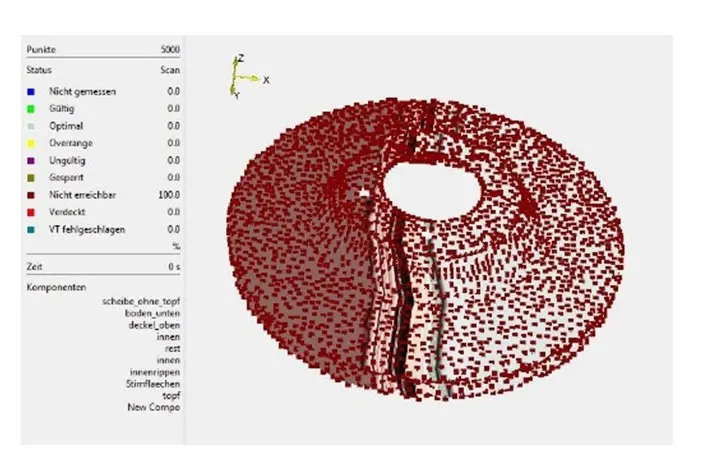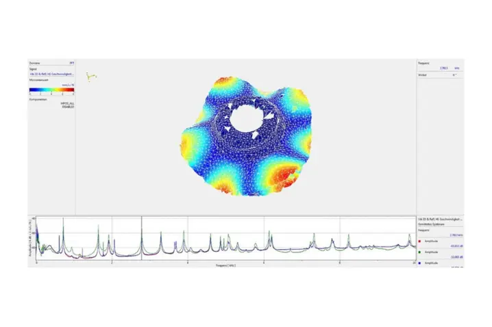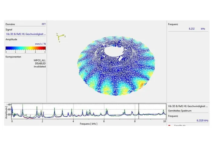 接下来, 编程确定机器人位置约为20个,通过扫描头内置的摆镜完成制动盘整个表面的振动测量。参考点的确定、机器人的位置编程及程序的试运行只需一个工作日。到此,整个测量系统已经准备就绪。整个测试过程无需专人看守,因为RoboVib测试系统可以自动完成整个模态测试工作。它甚至能通宵工作而不占用工作时间。