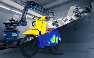 相比之下,扫描式激光测振仪使用激光作为探测手段,不存在任何附加质量影响,而且理论上,测量点数总是能满足实际需求;可直接将仿真模型的有限元网格或CAD图的几何数据导入至测量系统软件中,再使用软件内置的定位校准程序对其坐标位置进行修正,通过这种方式获得的测量结果更精确,更有意义,而且测试所需时间也大为减少,尤其当把扫描式激光测振仪安装在机器人系统上进行全自动测试时(如图1所示),这种优势就更为显著。基于机器人的RoboVib®测振站具有很多优质,以下实例就是最好的证明。