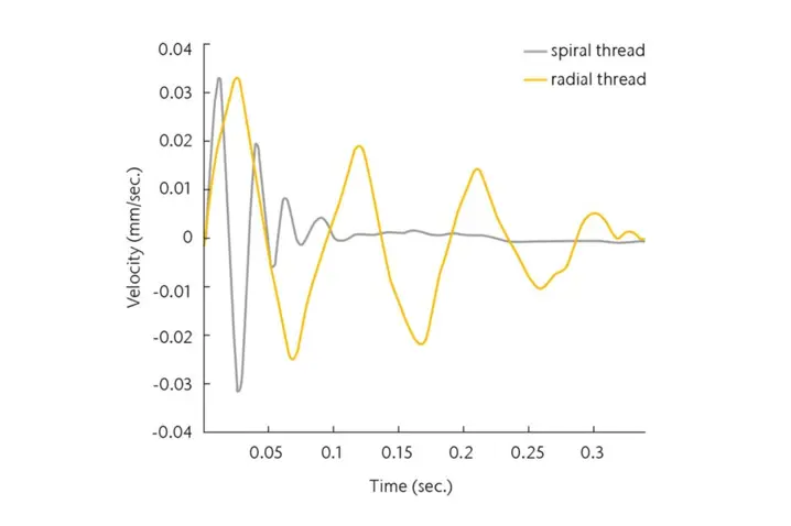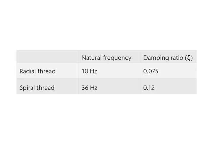 实地振动阻尼测试表明,横丝具有较高的减振性能,它能瞬间将振动冲击分散至纵丝;纵丝能通过消耗横丝传递来的能量来防止蛛网破裂,从而保持蛛网的结构完整性。