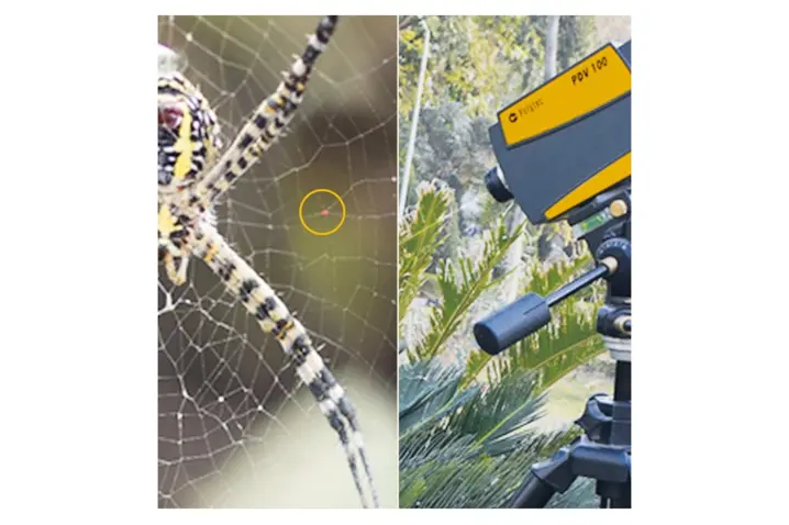 本次实验中,我们使用的是德国Polytec公司的PDV-100数字便携式激光测振仪,来测量重量非常轻的蜘蛛丝的阻尼特性。对于这类轻质结构,我们只能选用非接触式振动测量系统,如PDV-100,因为如此轻质的螺旋丝线结构是无法承受如黏贴式加速度计或应变计等传统接触式传感器的重量。