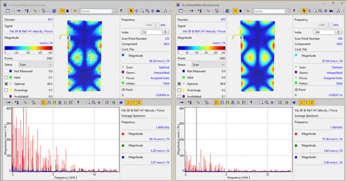 图3显示了分别采用SAM自动力锤(左)和Qlws惯性激振器(右)作为激光方法的典型结果。