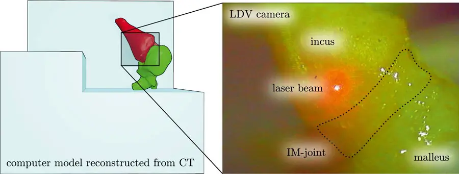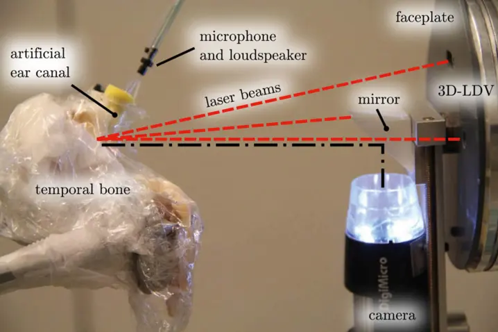 人类的中耳将由声波所引起的鼓膜振动通过听小骨传输至内耳。在接近听觉阈值时,鼓膜所产生的三维振动位移仅有几个纳米,因此,研究人员需要使用非常精准的非接触检测设备来测试这类振动