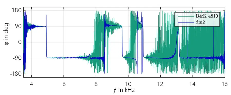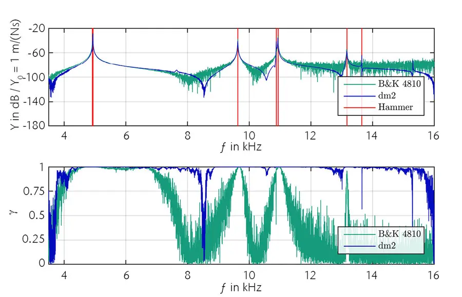 可以明显看出,B&K 4810 振动台在约 7kHz 以上能够施加到系统的能量不足,无法获得令人满意的信噪比,从 7kHz 起传递导纳曲线中的相干性以及明显可辨的噪声水平就能说明这一点。使用 dm 2 时,它适用于在高频范围内采集系统响应。由于输入能量显著更高,能够清晰地采集传递函数,图 3 中相位频率响应的对比也说明了这一点。