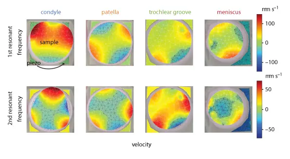 In her article, Dr. Espinosa shows how the dynamic modulus G* can be extracted from the measured resonance frequencies of a disk-shaped test sample when looking at only the 1st and 2nd order modes.Using phase/time delay measurements, the viscoelastic properties (loss modulus G” and storage modulus G’) can be extracted.Thus, with a single tool, vibrometry greatly facilitates meeting multiple regulatory recommendations for mechanical characterization of cartilage replacements.