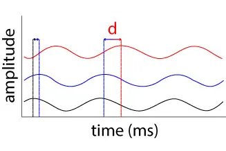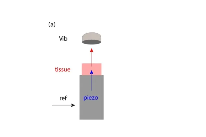 This was followed by a 500 Hz sinusoidal excitation to determine the viscoelastic properties of the tissue. A sinusoidal reference signal (black) drives the slightly shifted piezo’s response (blue). The shift is shown as the difference between the black and blue dotted lines. The tissue’s periodic deformation is shown in red, with the phase shift with respect to the piezo signal given by δ.