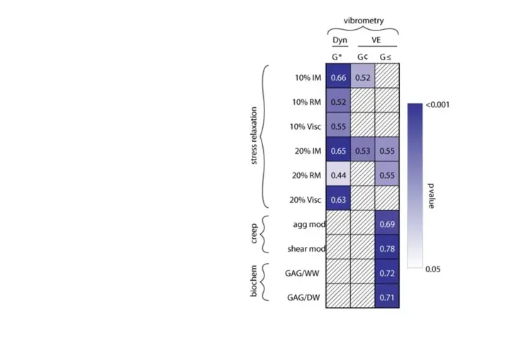 The table summarizes the strength and significance of Spearman ρ correlations of dynamic modulus G*, the storage modulus G’ and the loss modulus G’’ derived with non-destructive vibrometry measurements and traditional destructive assays used in cartilage research.