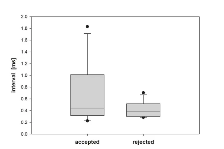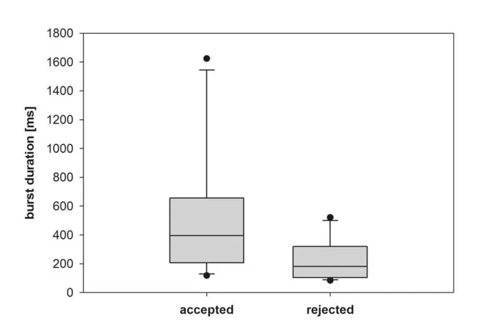 通过数据分析我们可以看到,雄蜂胸腔振动有1~ 9段(持续振动),每段包含大约10 - 220次爆发式脉冲振动(图1)。交配前,被接受的雄蜂的爆发脉冲振动持续时间明显长于被拒绝的雄蜂(图2),而且爆发脉冲的时间间隔似乎更短,但差异不是很明显(图3)。