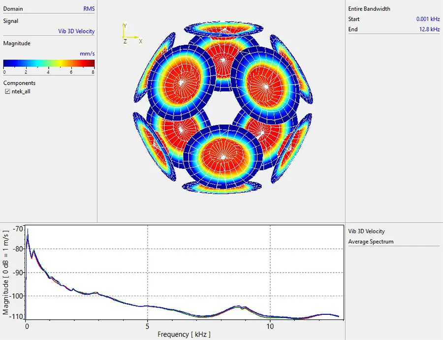 The performance of the dodecahedron depends not only on the synchronicity of the individual loudspeakers but also on the mechanical stiffness and robustness of the housing. Here, a vibrometer scan with RoboVib® shows the low vibration behavior of the dodecahedron housing compared to one of the loudspeakers.