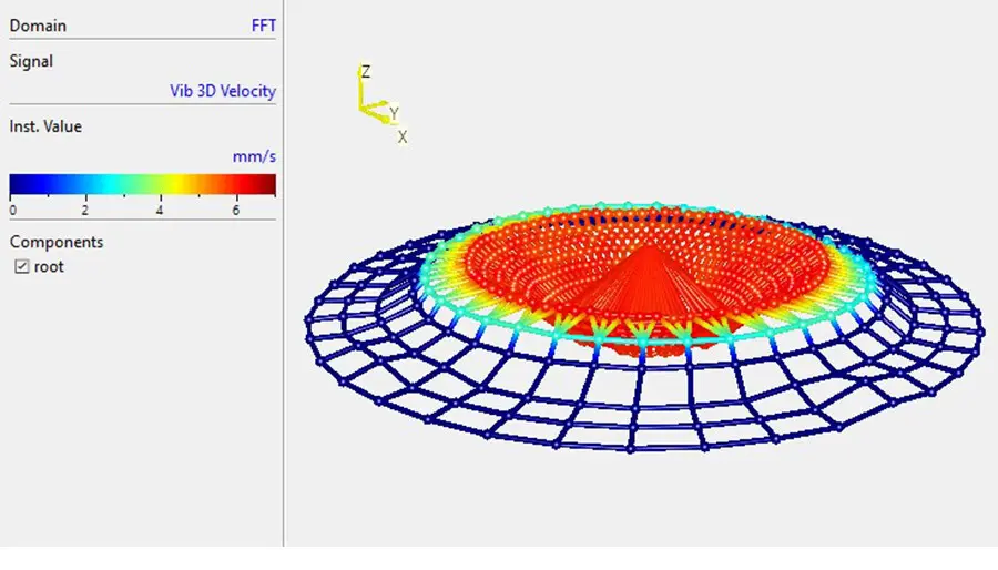 As a result of all scan points, the 3D animation provides information about the magnitude and phase of each scan point. As shown in Figure 2, the RMS value distribution of the velocity magnitudes are one of these insights. Thanks to the high-resolution measurement grid, the deflection shapes of the loudspeaker, which become increasingly complex with higher frequencies, can be visualized immediately after the measurement.