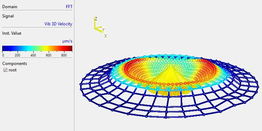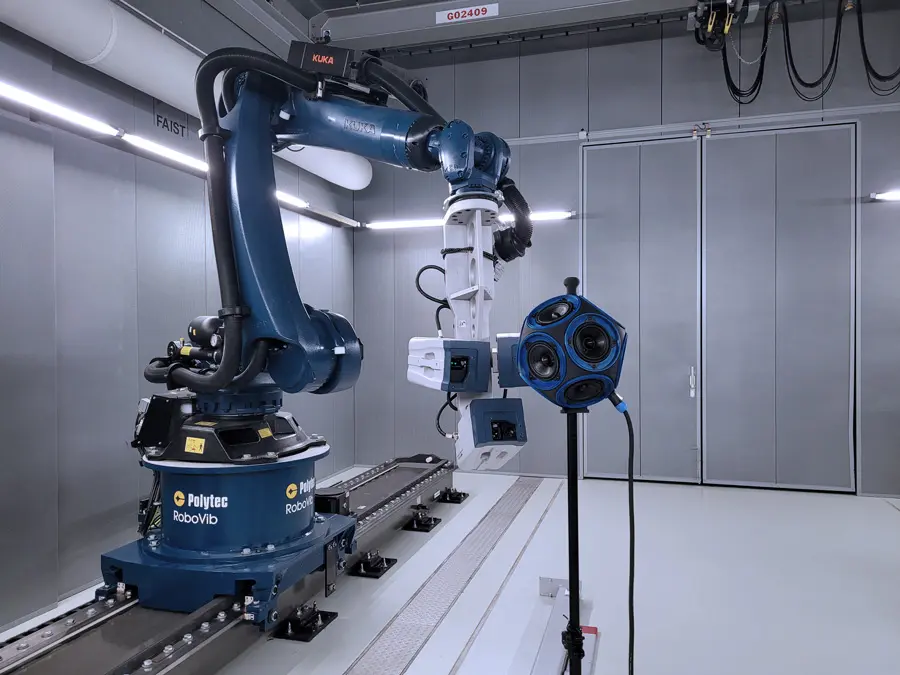 One of the major advantages of the robot-assisted laser scanning vibration measurement is its unlimited spatial resolution, especially in comparison with alternative measurement methods like mounting accelerometers. In addition, the high-precision laser measurement ensures unaltered results because its non-contact and mass-free working principle. These unaffected measurement results visualized as animated 3D operational deflection shapes shown in the evaluation software are the proof of quality and high fidelity of this NTEK dodecahedron.