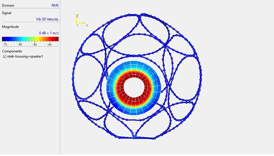This innovative sound source of a dodecahedron is specifically designed for testing room and building acoustics, for example to verify the sound insulation of walls. In order to generate high sound emissions over a wide frequency range, all integrated individual loudspeakers are required to vibrate phase-synchronously. The structural dynamics of the membranes play the decisive role, as they determine the final vibration characteristics and thus the overall deflection of each loudspeaker. The quality of such a loudspeaker is primarily determined by uniform radiation. This is described by the magnitude ratios and the phase relationships between the individual loudspeakers.