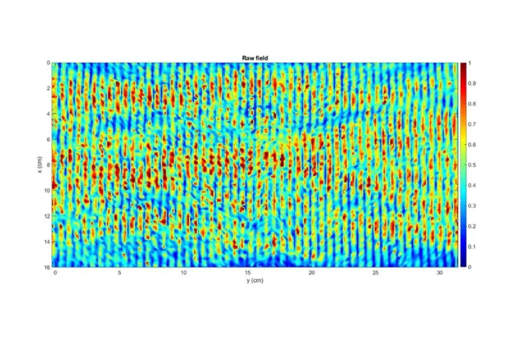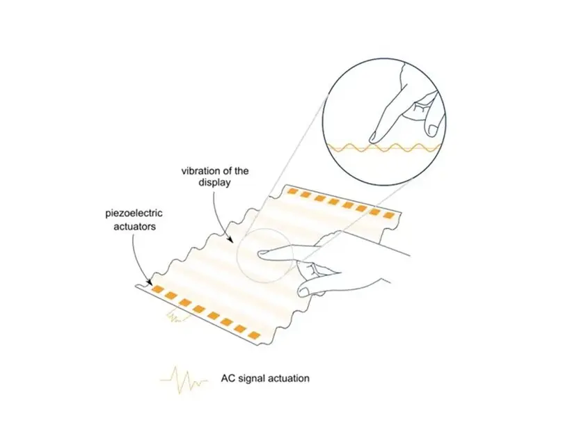 Ultrasonic vibration is generated by activation of piezoelectric elements which create a flexural wave in the display. The response of the system to this excitation is measured to obtain vibrational maps as shown in Figure 3.