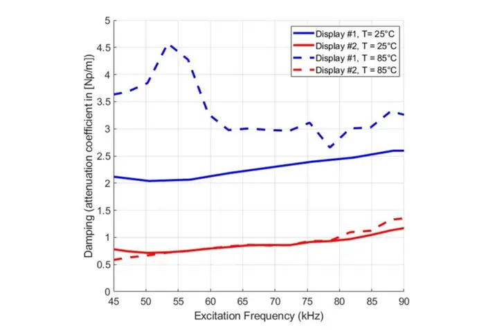 Figure 4 shows an example of two different types of displays characterized at room temperature and 85°C. Display n° 1 (blue curves) shows a higher damping than display n°2 (red curves) already at room temperature and an increase to even higher values at higher temperatures (see dashed blue curve).