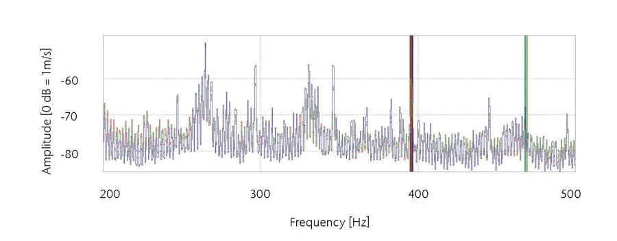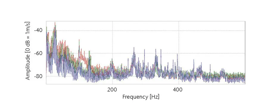 With this simple measurement set-up, similar results were achieved when compared to those obtained with a real car tire on a commercial roller test bench. In figure 2, the averaged spectrum over all points along the three directions (see the three different colors) is shown. In figure 3, an expanded scale shows the details of the spectrum from 200 Hz to 400 Hz. A comb-like feature is easily distinguished in the spectrum.