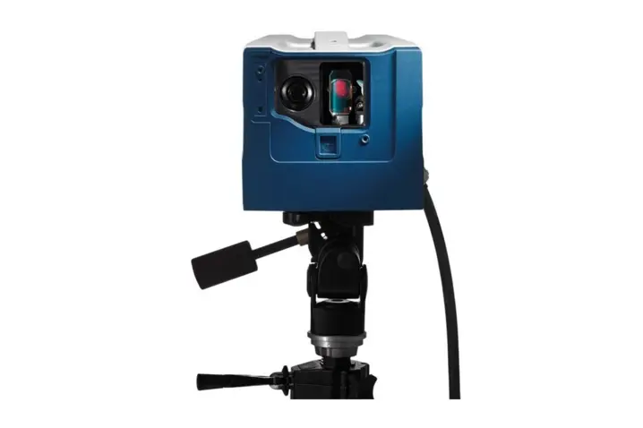 The PSV-3D Xtra system had its three heads mounted into a common ­frame and placed on the lab table near the test bench. This common frame simplified the repositioning of the heads when covering different portions of the tire. A large mirror was also used to access different portions of the tire without movement of the common frame.