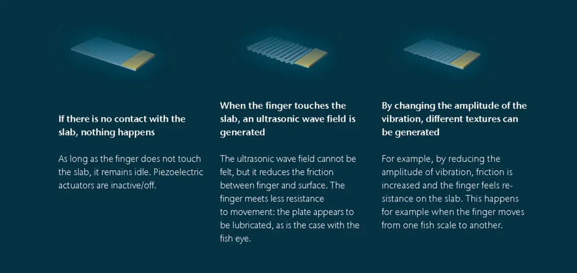 Hap2U technology generates an ultrasonic wave field on the surface that comes into contact with the skin. Using piezoelectric transducers, ultrasonic waves are emitted, vibrating several thousand times per second and they pressurize the small volume of air trapped between the fingertips and the screen. This creates an acoustic levitation force that reacts against the pressure applied by the fingertips. The contact surface area is reduced, thereby reducing the friction coefficient.