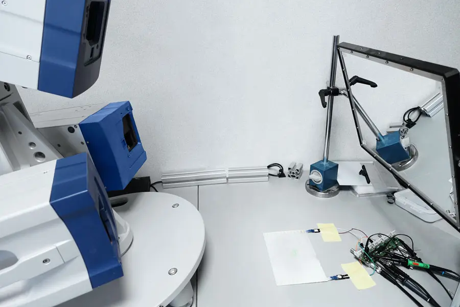A crucial step prior to the technology going into production is to ensure that the client’s product is compatible with our limitations. We prepare a prototype for the client based on an existing product or upcoming product into which we integrate our “haptic layer”. The focus of this stage is the characterization of the client’s sample from which we extract the propagation parameters over a wide frequency range. The 3D vibration mapping with the PSV Polytec Scanning Vibrometer is done in a very short time and is the basis of our design process for the final haptic interface. Following the digital design steps, the 3D vibration characterization thus obtained allow us to control and refine our simulations if necessary.