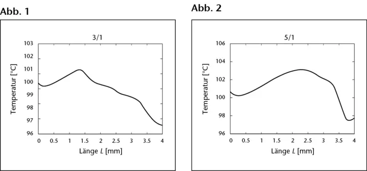 Figures 1 and 2 show the temperature profile from the upper steam outlet down to the condensate inlet located 4 m below. At a constant operating pressure of the process fluid of 1 bar, the pressure of the heating steam was varied between 2 and 5 bar. A spatial shift of the maximum in the temperature profile was observed. The spatial resolution of the measurement was 5 mm. The pressure at the outlet of 1 bar corresponds very well to the measured 100°C (boiling point of water). Toward the inlet, the pressure increases to approximately 1.4 bar, which corresponds to a local decrease in temperature of 3 to 4°C. This is confirmed by the distributed temperature measurement.
