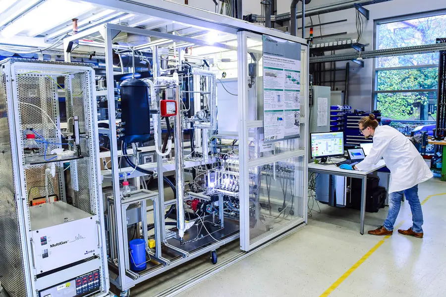 Methanol synthesis, as part of a Power-to-Liquid process, produces methanol from hydrogen and CO₂. The Fraunhofer facility serves to study synthesis at an industry-relevant scale. Research focuses include dynamic reactor operation and unconventional gas mixtures combining electrolytic hydrogen with CO₂-containing gas streams.