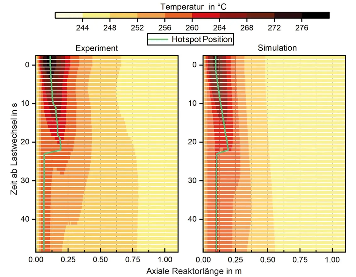 Image 3: Heat distribution along the reactor length over time after a load change. Fiber-optic measurement results (left) compared to simulation (right). (Source: Nestler, Florian (2022): Dynamic Operation of Power-to-X Processes Demonstrated by Methanol Synthesis. Dissertation. DOI: 10.5445/IR/1000150267)