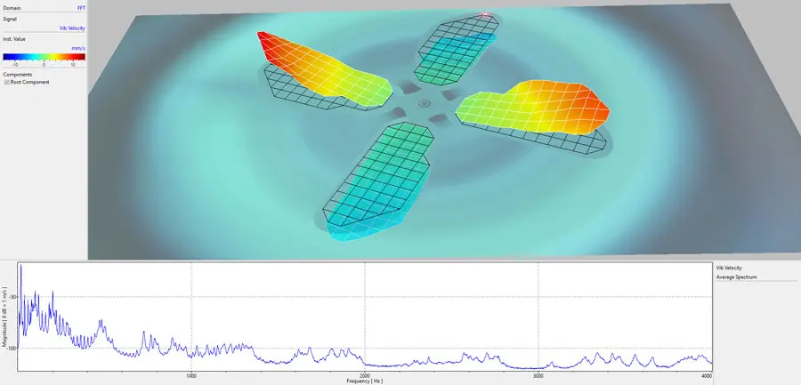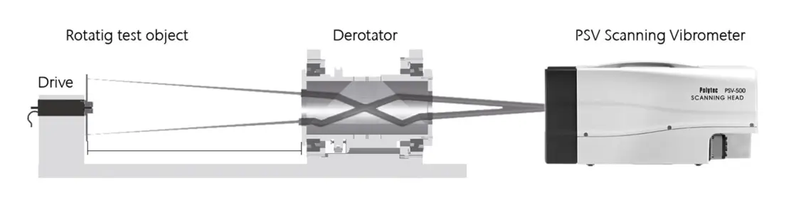 The dynamic behavior of propellers changes during rotation especially at high rpms as the centrifugal forces pull on the propeller blades. This is very difficult to simulate and real operational data is very beneficial. Therefore, operational deflection shapes of rotating structures, like fans and propellers, are typically captured by means of Polytec’s Derotator. The Derotator is an add-on to the scanning vibrometer that spins the laser beam synchronously to the propeller’s rotation by means of a rotating prism as can be seen in Figure 3. In the software a still-image is visible as the Derotator removes the rotating motion from the image. Upon axial alignment of the propeller and the prism the measurement process is equivalent to a test on a stationary object.