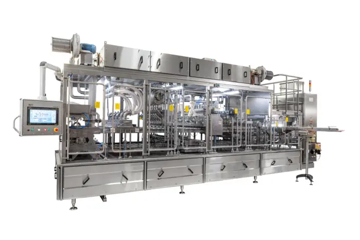 It is suitable for all liquid to viscous food products such as yogurt, dairy creams, desserts, ready meals, butter, or spreadable cheese. The pulsed UV technology delivers high peak energy for effective decontamination of cups and lids, achieving up to Log 4 disinfection—eliminating up to 99.99% of microorganisms reliably.