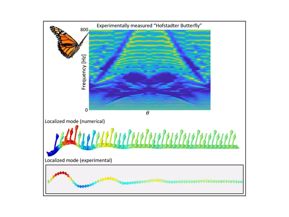 By reconfiguring our sample and performing a sequence of experiments, we were able to capture the variation of the frequency response as a function of θ . The results are summarized in Fig. 2 in the form of a colormap plot, with the color corresponding to the response averaged along the span of the beam as a function of θ (x axis) and frequency (y axis). In the figure, yellow lines mark the variation of the response peaks associated with the resonances of the beam, while blue regions are associated with bandgaps that result in low vibration levels across the beam. Notably, the picture forms a spectral map that resembles a Hofstadter Butterfly (hence the butterfly image).